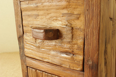 全面の自然杢凹凸が大変深く、美しい、引出し三段小棚です。小さめの作品ですが、収納は豊富に行えそうです。