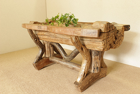 飼い葉桶を中央部に利用されて作られた、丸太プランターです。
