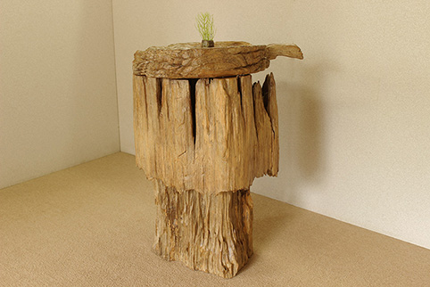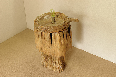 天板には丸く分厚い一枚板を用いて作られた、珍しい飾り台です。