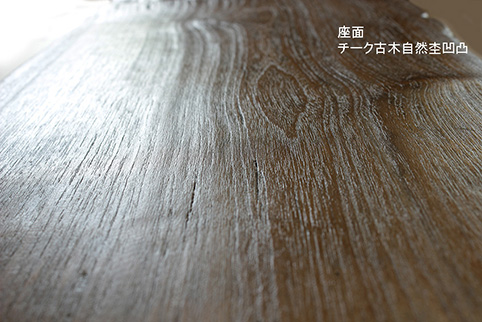 伐採後約150年〜50年もの間、自然の風雨に晒され、ようやくこの様に非常に 美しい杢の凹凸が出来ます。チーク材だからこそ、現在でもこの様に1つの作品として生き残っているのです。手で触れてもその感触は凄く優しく、時の流れを感じる事が出来ます。日本でこれ程自然素材の凹凸の美しい品物は、なかなか見る機会が少ないと思います。
