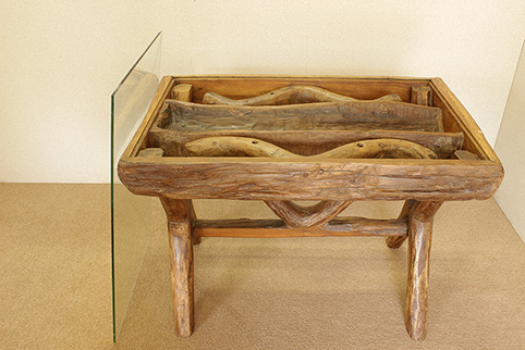 中央部に飼い葉桶を用いて作られた、Highガラステーブルです。