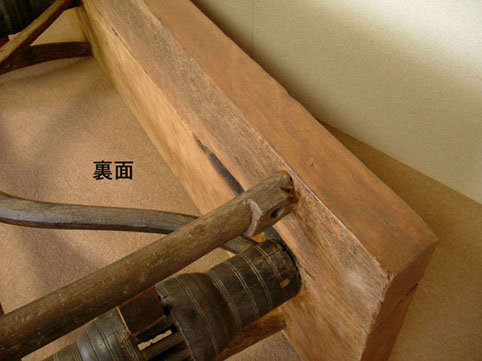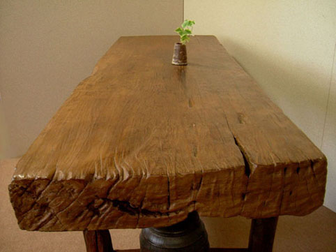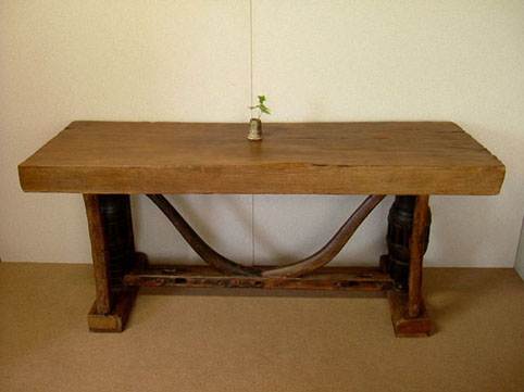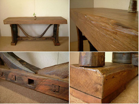天板の自然杢の凹凸はもちろん、昔牛車の車軸部に利用されていた黒っぽいマイデン(紅木)材の脚部分など含め、貴重な品物です。