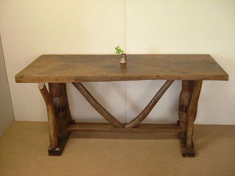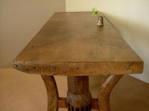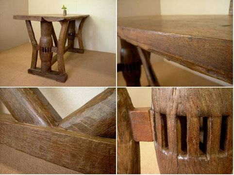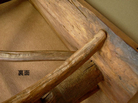 自然杢の凹凸や焦げ跡はもちろん、むかし東南アジアで牛車の車軸部に利用されていた黒っぽいマイデン(紅木)材の脚部分など含め、貴重な品物でございます。