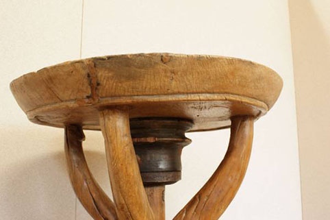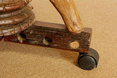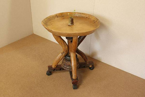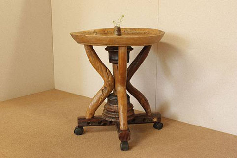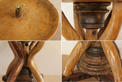 東南アジアで約50年〜150年前に実際に使われていた(何に使われていたかは不明です)一枚板をくり抜いた円形の天板に、脚などには牛車の太い車軸部や、牛の背中にのせて利用されていた頸木(くびき)など、現在では大変貴重な素材を用いて作られた、移動可能なワゴンテーブルです。