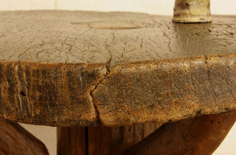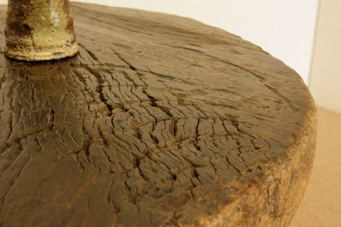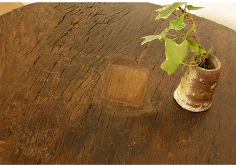 天板中央には、四角の穴を木で埋めた跡がございます。角材を通していたのでしょうか??不思議な材木です。写真では木の表面が荒々しく見えますが、実物は自然に晒されて丸びをおび、凄く優しい手触り感になっております。