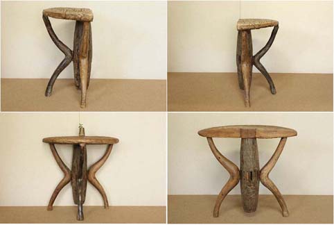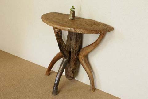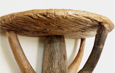 3本の脚は50年〜150年前に牛の頸付近にのせ利用されていた品物です。頸木と呼ばれております強靱な1本の曲木です。