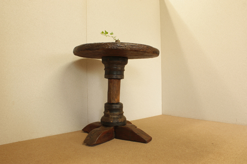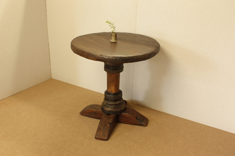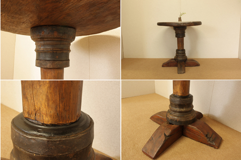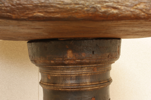 天板と脚の部分をつなぐ鉄枠の付いた分厚い丸い材料は今から約50年〜150年程前に東南アジアで牛車の車軸に実際に使われていた、大変貴重な素材です。 天板は黒っぽい色ですが、チーク材です。分厚い板なのですが伐採後約100年が経過してもほとんど割れが出ておりません。(不思議なくらいです)中央部に四角い穴を木で埋めた跡がございますが、何に使われていた板なのかは不明です。
