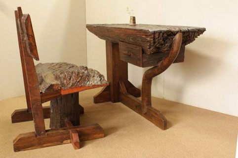 伐採後約150年と現地でも言われておりますが、この材料(木材)はもっと経過していると思われます。 机、椅子共に自然杢の凹凸が非常に深く、決して実用的ではございませんが、疲れた時など自然杢の美しさを眺めながら、コーヒーなどお楽しみ頂ければと思います。荒々しい木の表面の手触り感が凄く優しいのは不思議な程です。 焦げ跡が非常に印象的な作品です。