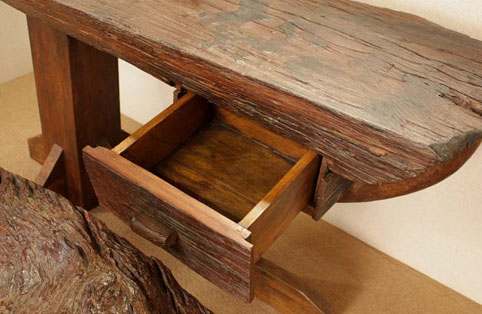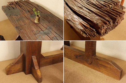図太いマイデン(紅木)の古木で作られた、テーブルセットです。マイデンは紫檀材と良く似た材質で非常に堅く、これ程堅い木材が、この様に深い自然杢の凹凸が出来るまでに、いったいどれ程の期間がかかったのか、想像もつかない程です。最初に木が見つかった時に土の中に埋もれていた為なのか、入荷時(輸入した時点)にはテーブルの天板の荒々しい木口に、小さな木の根っこが付いていました