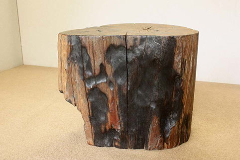 木の塊で大きな凹み小さな凹凸痕、黒い焦げ跡、