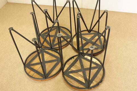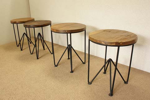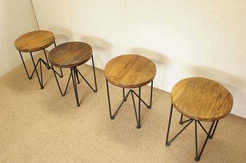 座面にチーク古木自然杢が、大変深く美しい板を用いて作られた、丸形椅子(鉄脚)4脚セットです。