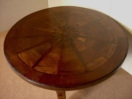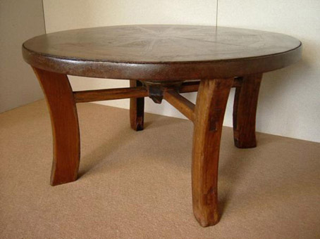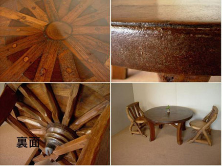 昔、牛車の車輪に用いられていた鉄の部分(実際に使用されていた物です)にチーク古木の板を上手くはめ込み製作された円形テーブルの出品です。脚の部分は車輪部に使用されていた材料です。裏面車軸部付近の造りが素晴らしく、見事です!なかなか入荷困難な作品です!!