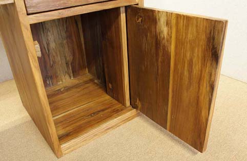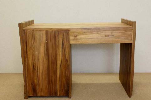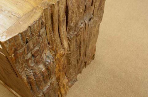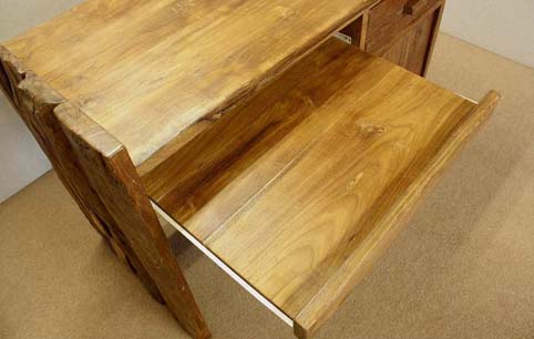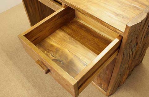 前面、左右つま板は自然杢の凹凸が深く美しく、天板は使い易さの為に、「ツルリ」とした表面となっており、実用的です。 凹凸した板と、チーク材の綺麗な木目の組み合わせがとても面白い作品です。