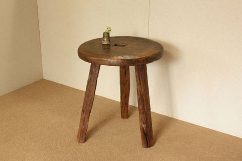 天板にマイデン(紅木)の分厚い無垢一枚板を再利用し作られた、大変珍しく貴重な三本脚円形テーブルのです。
