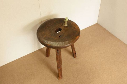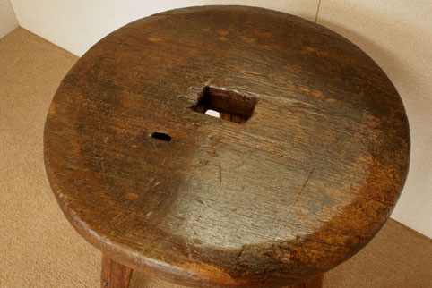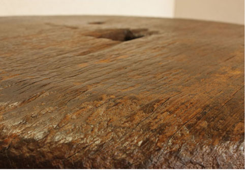 テーブルの天板中央には、長方形の穴があいております。角材を通していたのでしょうか?不思議な材木です。
