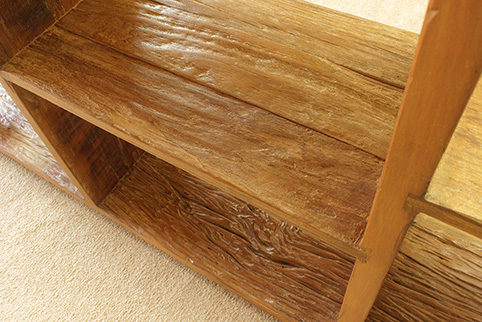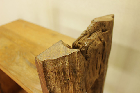 伐採後約、150年〜50年もの間、自然の風雨に晒され、ようやくこの様に非常に美しい杢の凹凸が出来ます。チーク材だからこそ、現在でもこの様に1つの作品として生き残っているのです。手で触れてもその感触は凄く優しく、時の流れを感じる事が出来ます。日本でこれ程自然素材の凹凸の美しい品物は、なかなか見る機会が少ないと思います。