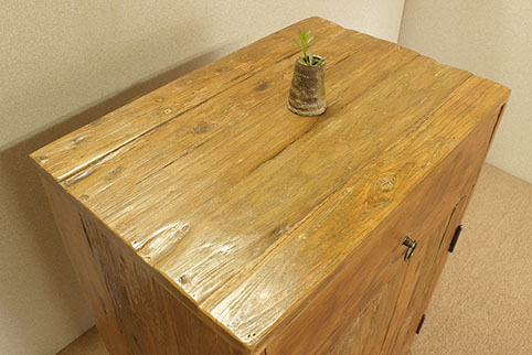 全面のチーク古木自然杢の凹凸が深く大変美しい、引き出付両開きキャビネットです。