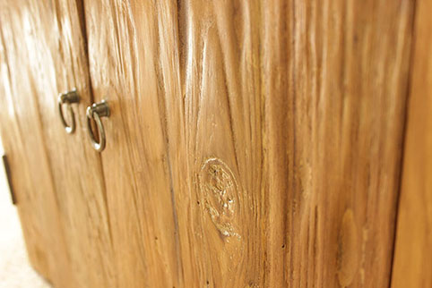 ★自然杢(しぜんもく)とは、東南アジアで約50年〜150年もの時を経て、天然の風雨などに 晒されて出来た(つくられた)チーク古木材の木の表面の凹凸(おうとつ)の事です。