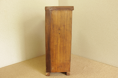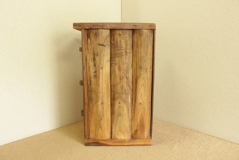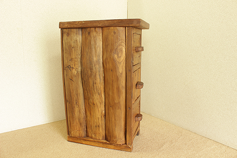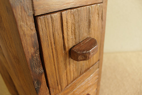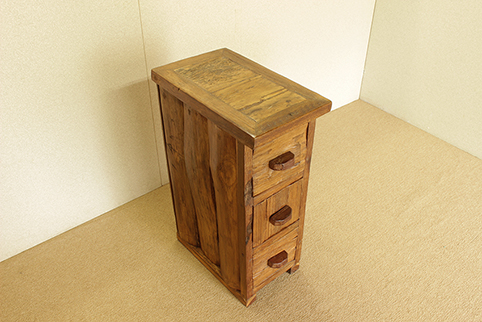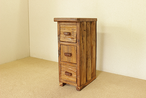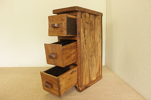 全面の自然杢凹凸が大変深く、美しい、引出し三段小棚です。小さめの作品ですが、収納は豊富に行えそうです。