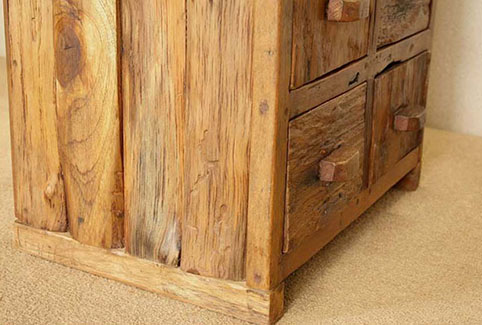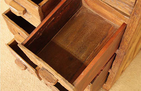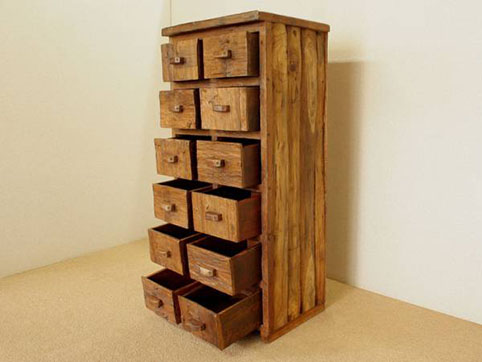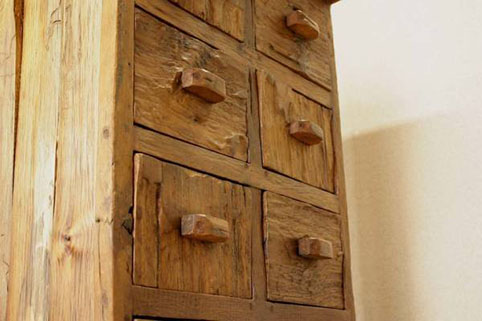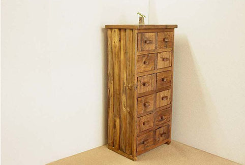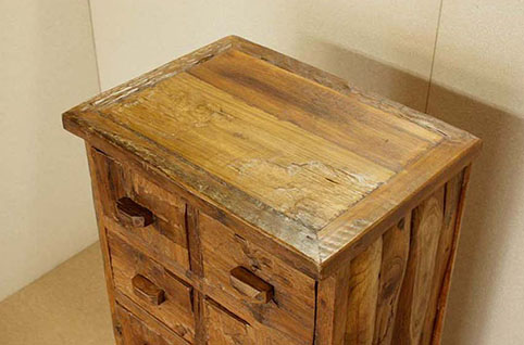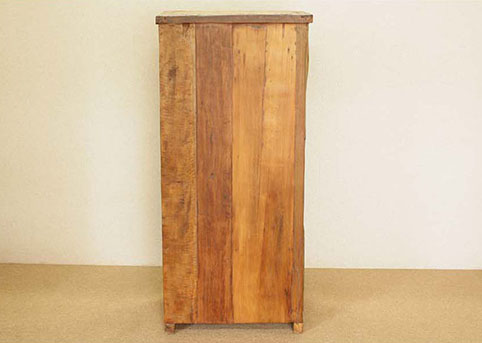 天板、引出しの前板に、チーク古木自然杢の凹凸が深く美しい板を用いて作られた、highチェストです。