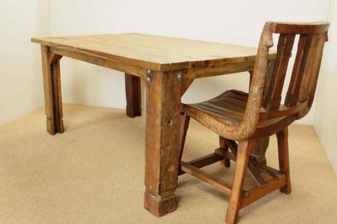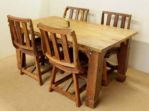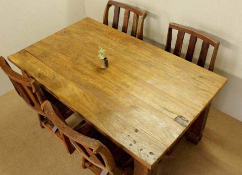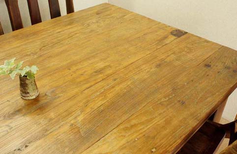 天板の厚みは約3pございますので、天板の上に重量物を置いても全く問題ございません。 天然材独特の板の表面に凹んだ場所や、凸んだ場所、穴や焦げ跡などがございます。 全体に凹凸はございますが、食事などには影響の無い程度だと思います。 椅子もわずかですが、入荷する事が出来ました。 テーブル、椅子共に大変貴重な出品になります。 是非この機会にお部屋のインテリアに取り入れて見て下さい。
