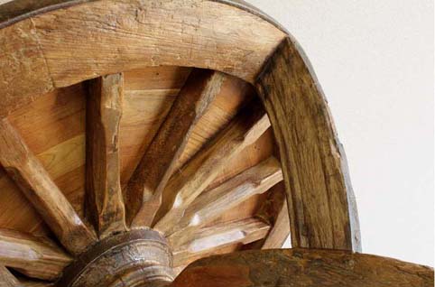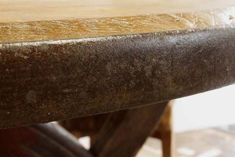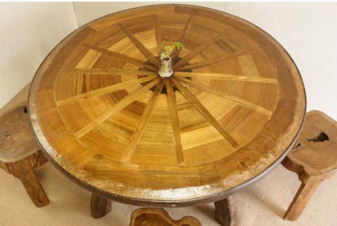約50年〜150年前に東南アジアで、牛車の車輪に利用されていた廻りが鉄枠の車輪に、チーク古木材を上手く組み込み製作された珍品テーブルです(まん中底から、天板中央部迄車軸を通していた穴跡がございます。今だに油分が染み出ております)重量は重く成人男性2名ではないと持ち運び出来ない程でございます。なかなか日本では目にする機会が少ない、大変貴重な逸品です。