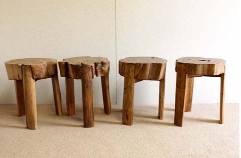 切り株スツールの4脚の座面形状は天然そのものです。いろいろな自然形状がとても面白い作品となっております。座面の割れ跡がございますが、入荷後約時間が経過している品物ですので、これから先割れの広がる可能性は低いと思います。