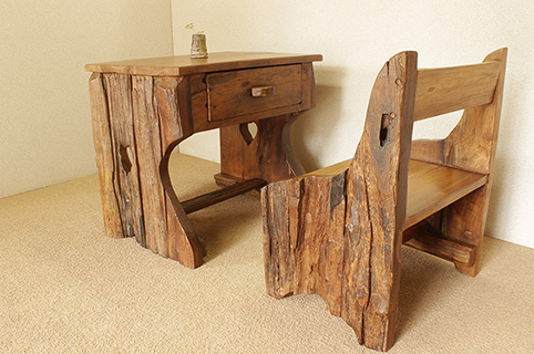 テーブルの天板、椅子の座面共に天然杢の凹凸が浅めですので、実用的です。時を経て自然の力で作られた古木とテーブル脚部分に彫られたハートのマークのミスマッチがとてもユニークです。