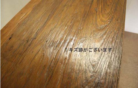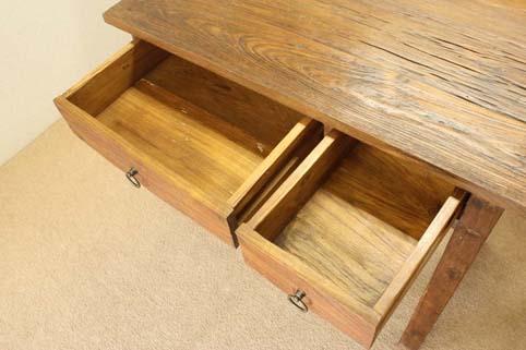 天板には東南アジアで約50年〜150年前に伐採され、家屋や塀などに利用されていた、チーク古木材天然杢の大変美しい板が並んでおります。 (現地で、これ程自然杢凹凸の深い品物は、なかなか見る機会が少なくなりました)