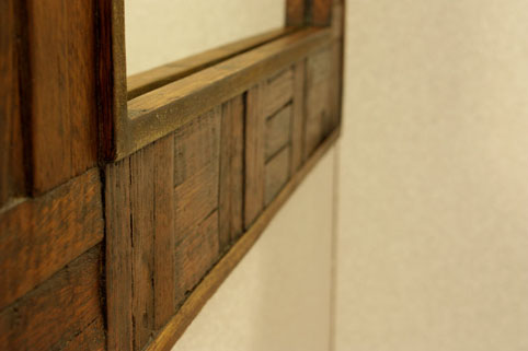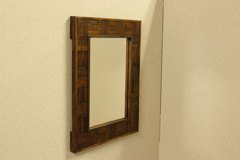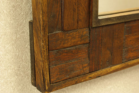 縁にチーク古木が複雑に組み込まれた、壁掛けミラーです