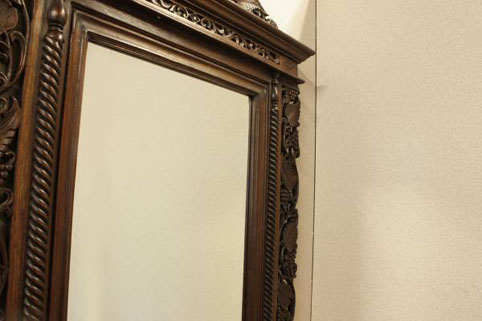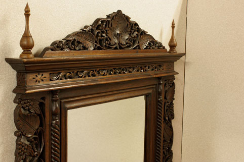 東南アジアで無垢のチーク材を切り抜き彫刻を施した非常に美しい全体の枠に、大きめサイズの鏡が取り付けられた、透彫額縁鏡です。