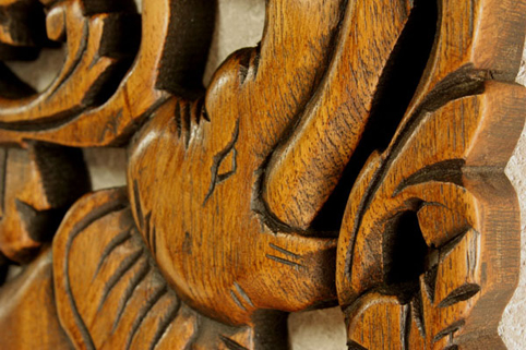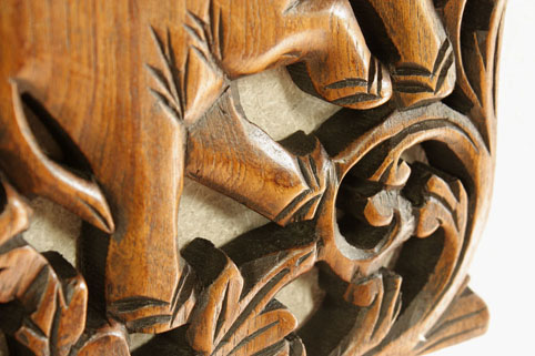 東南アジアで無垢のチーク材を切り抜き、彫刻を施した非常に珍しく手の込んだ作品です。