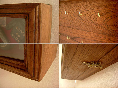 チーク古木を利用してつくられた、上開きオリジナルガラスケースです。裏面の上部にはフックが取り付けられておりますので、壁に掛けてお使い下さい。