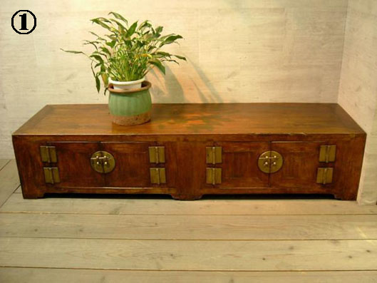 | A清朝様式家具... (清朝時代1616年〜1902年に製作された)家具をモチーフに製作されている新しい家具の事です。 同じく木材には主に楡欅や松を使用している製品が多く見られますが、無垢材の大きな太い材料を不断に使用した、非常にしっかりとした製品が多く見られます。 現在では木目を生かした透明感ある美しい品物が多く見られ、製作方法や塗りの技法は今でも未知の世界です。(太い材料でもまず、割れやトメの切れが出ません。不思議な程です)今現在造られている清朝様式家具も時代を経て、素敵なアンティーク家具になる事でしょう。 |